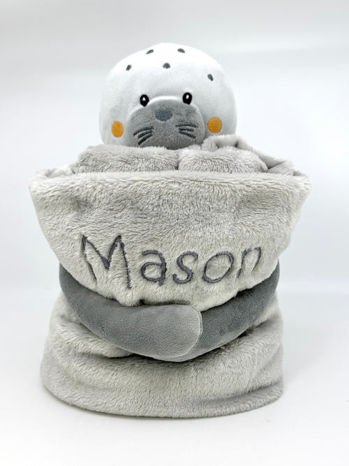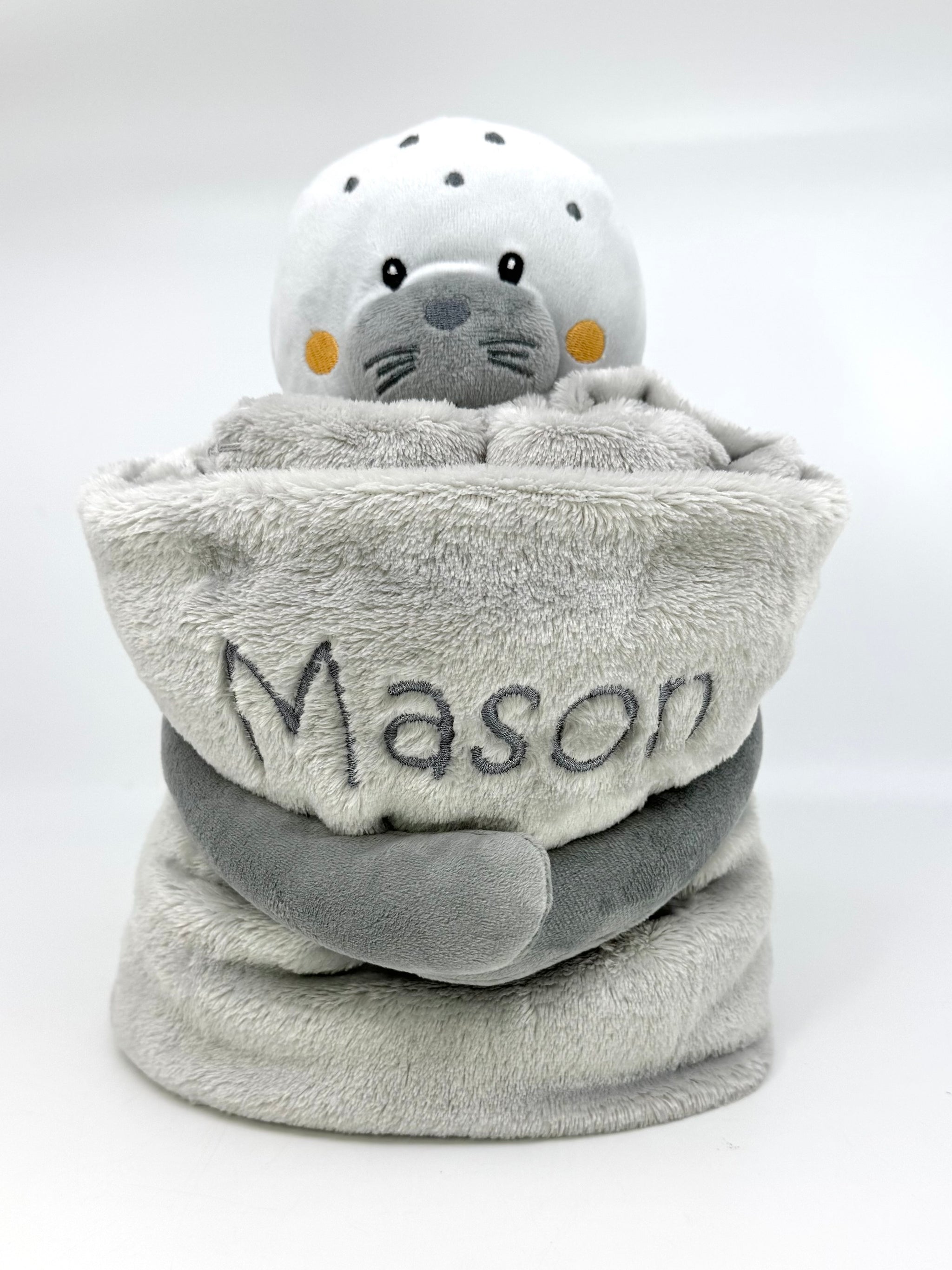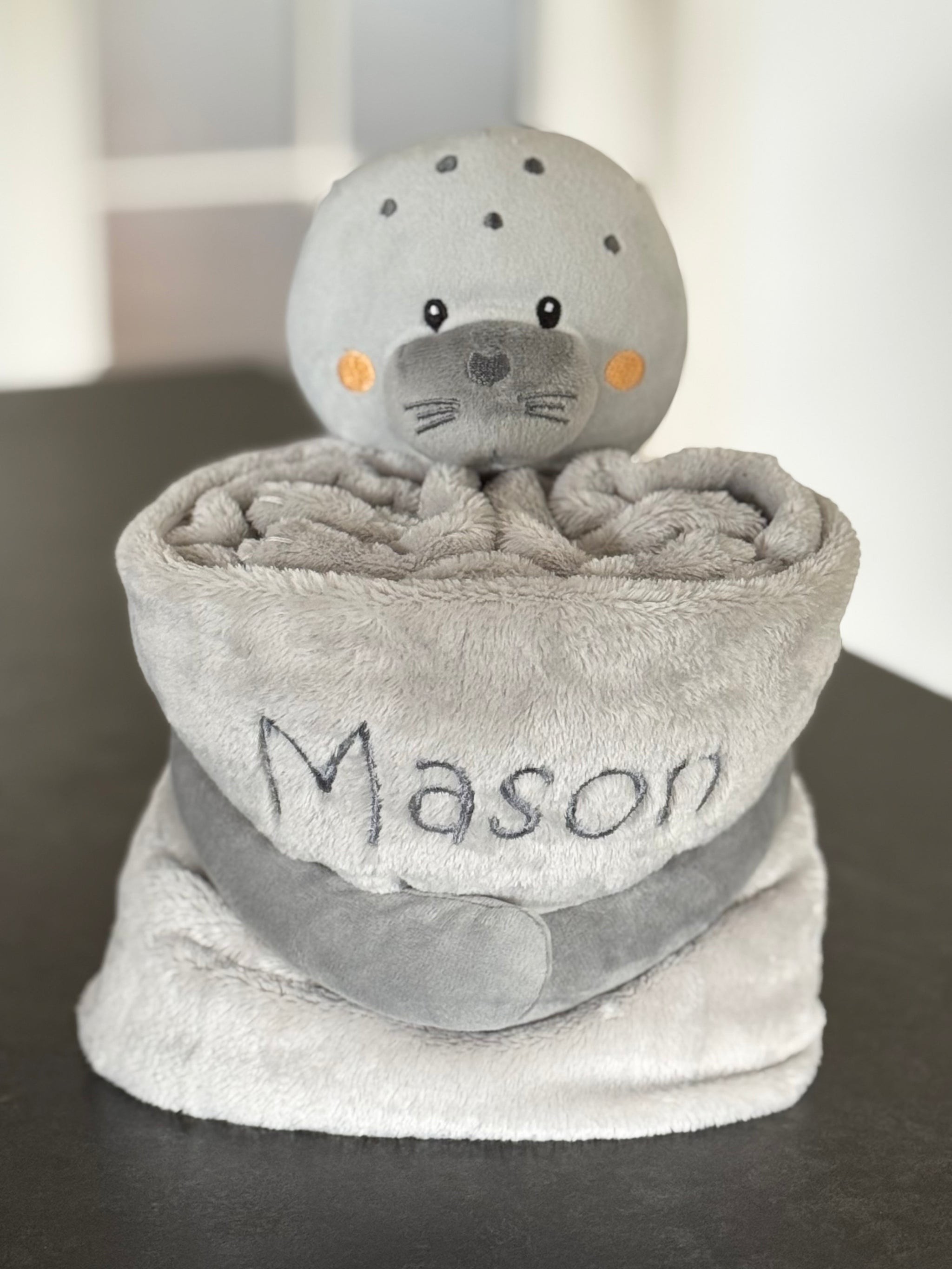 Super blødt tæppe der kan broderes navn på, samt en sød krammebamse.