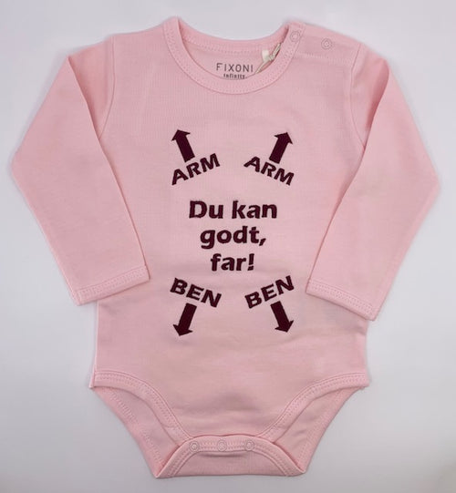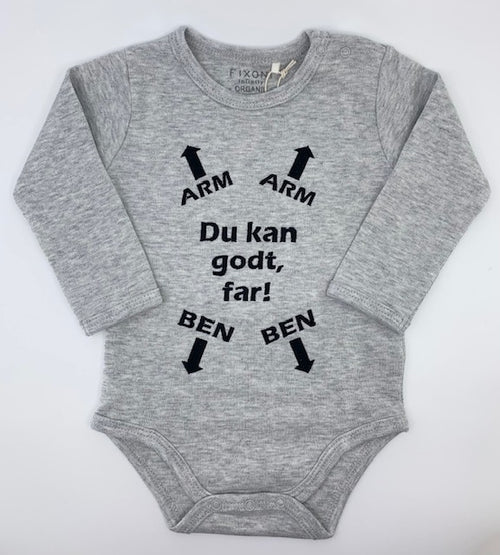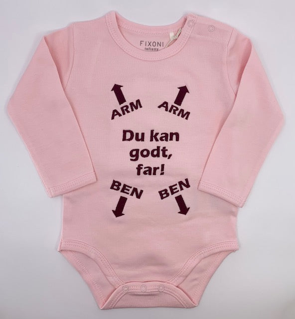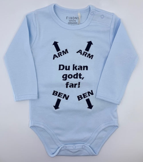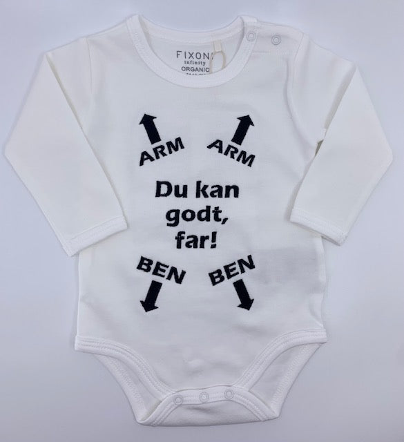 Skøn bodystocking med designet "Du kan godt far!" broderet på maven. Perfekt gaveidé til de nybagte forældre. Bodyen har praktiske trykknapper på skulderen og imellem benene.