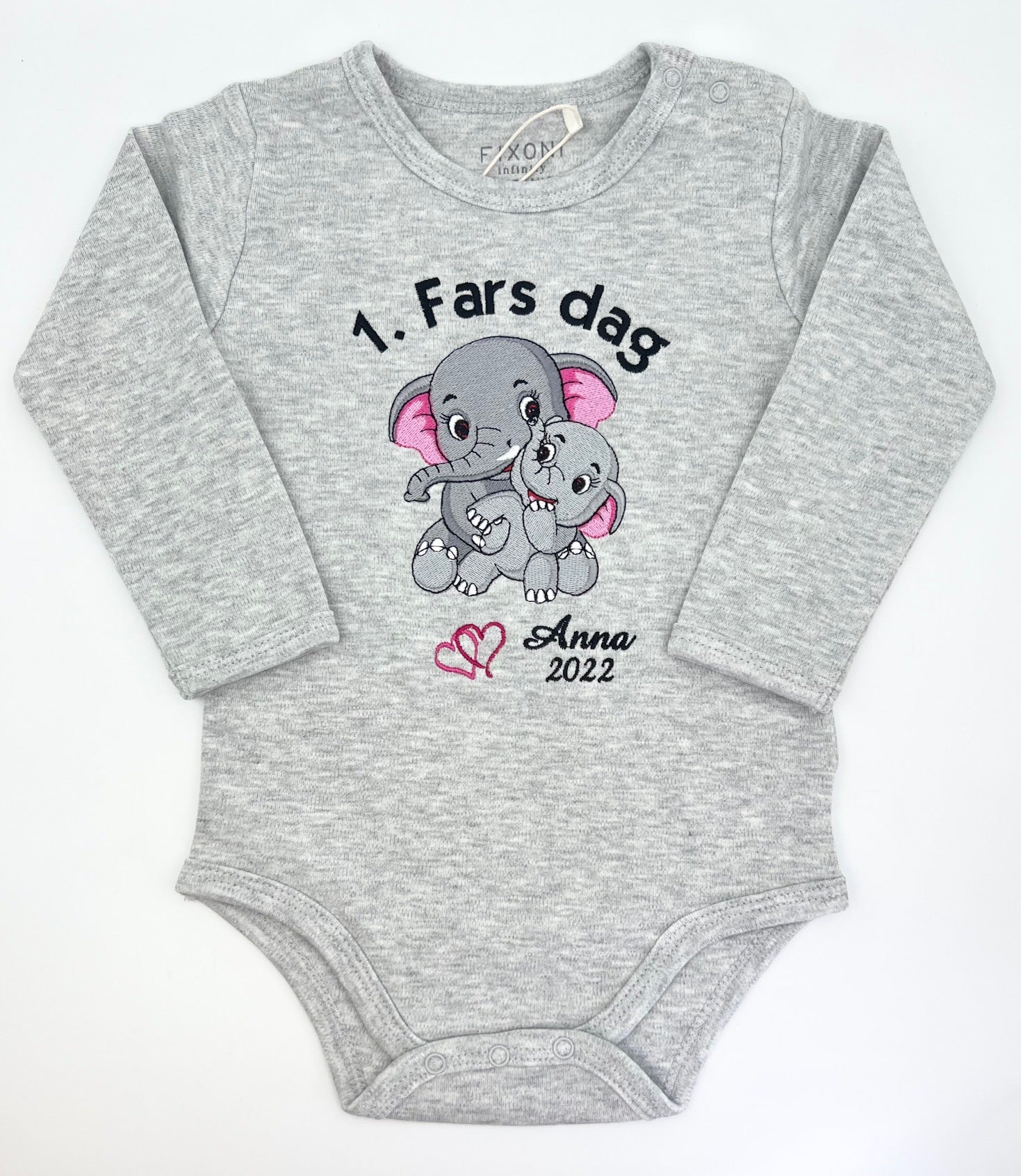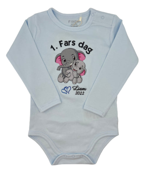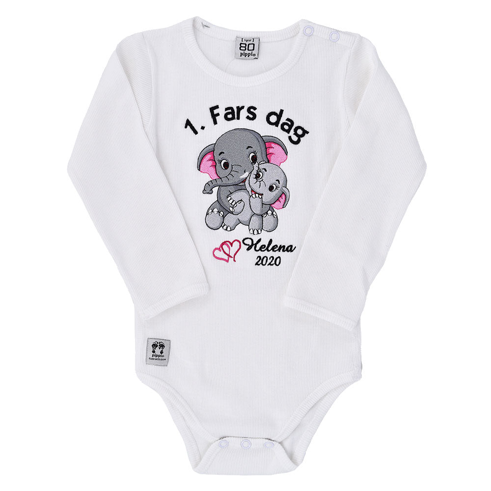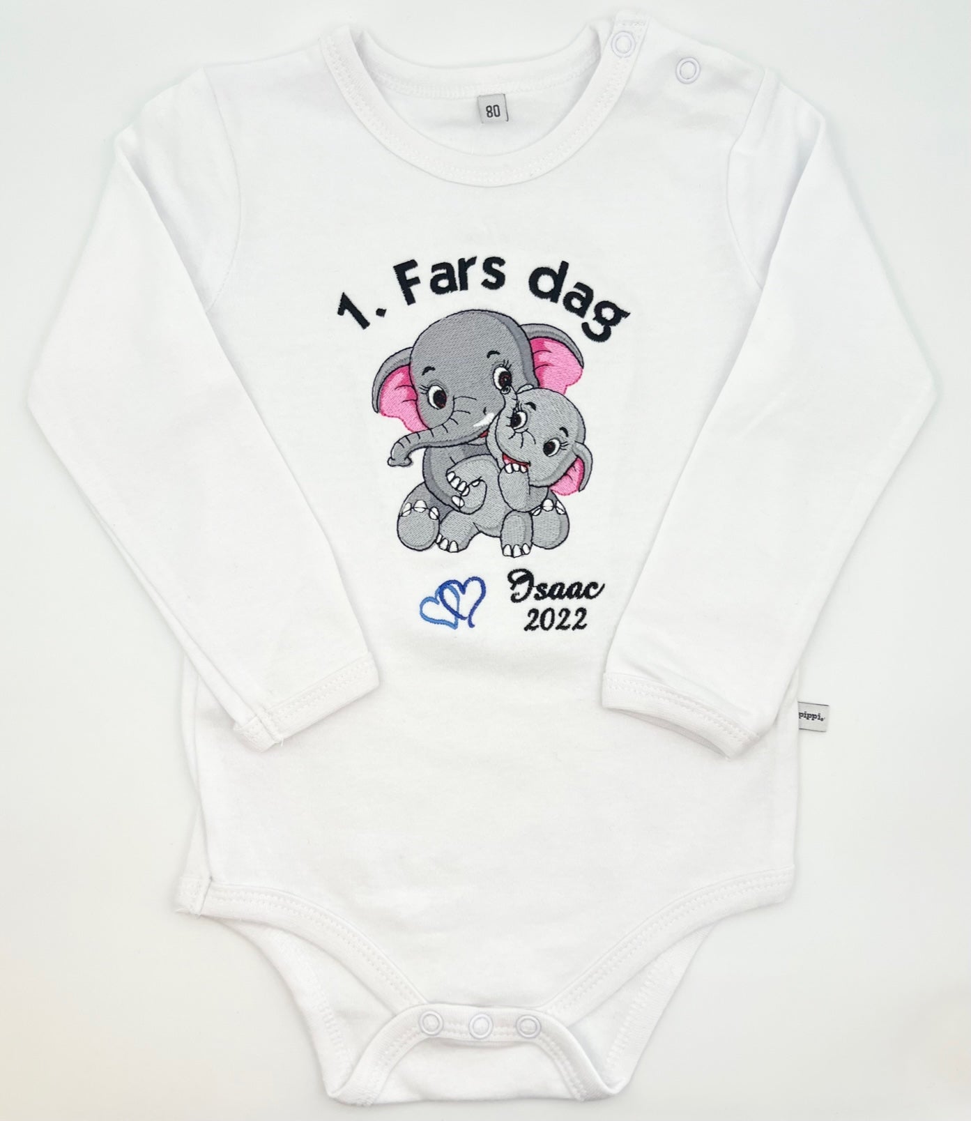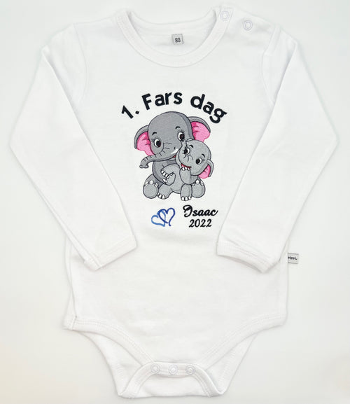 Skøn bodystocking til første fars dag med elefant broderet på maven. Perfekt gaveidé til de nybagte forældre. Bodyen har praktiske trykknapper på skulderen og imellem benene.