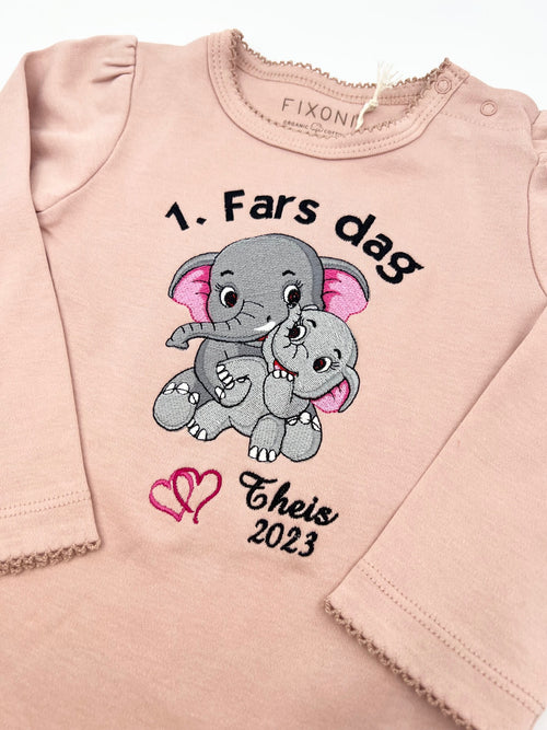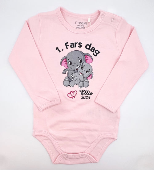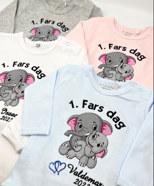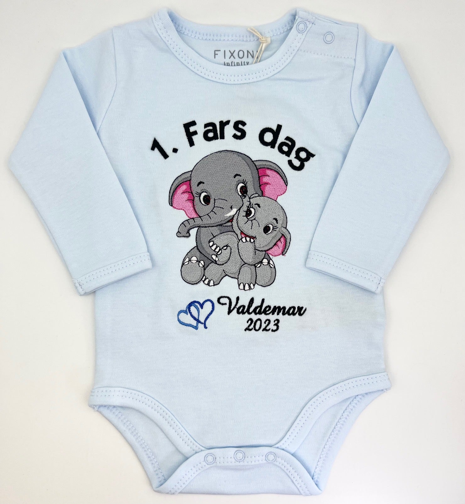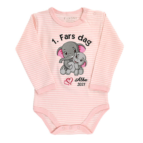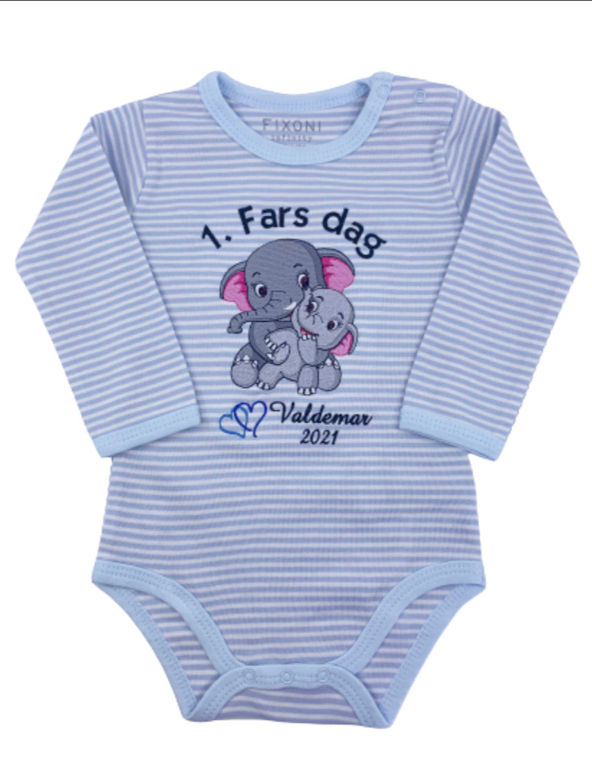 Skøn bodystocking til første fars dag med elefant broderet på maven. Perfekt gaveidé til de nybagte forældre. Bodyen har praktiske trykknapper på skulderen og imellem benene.