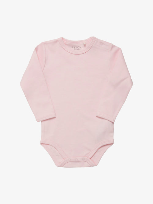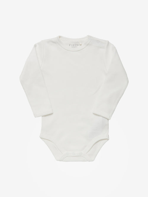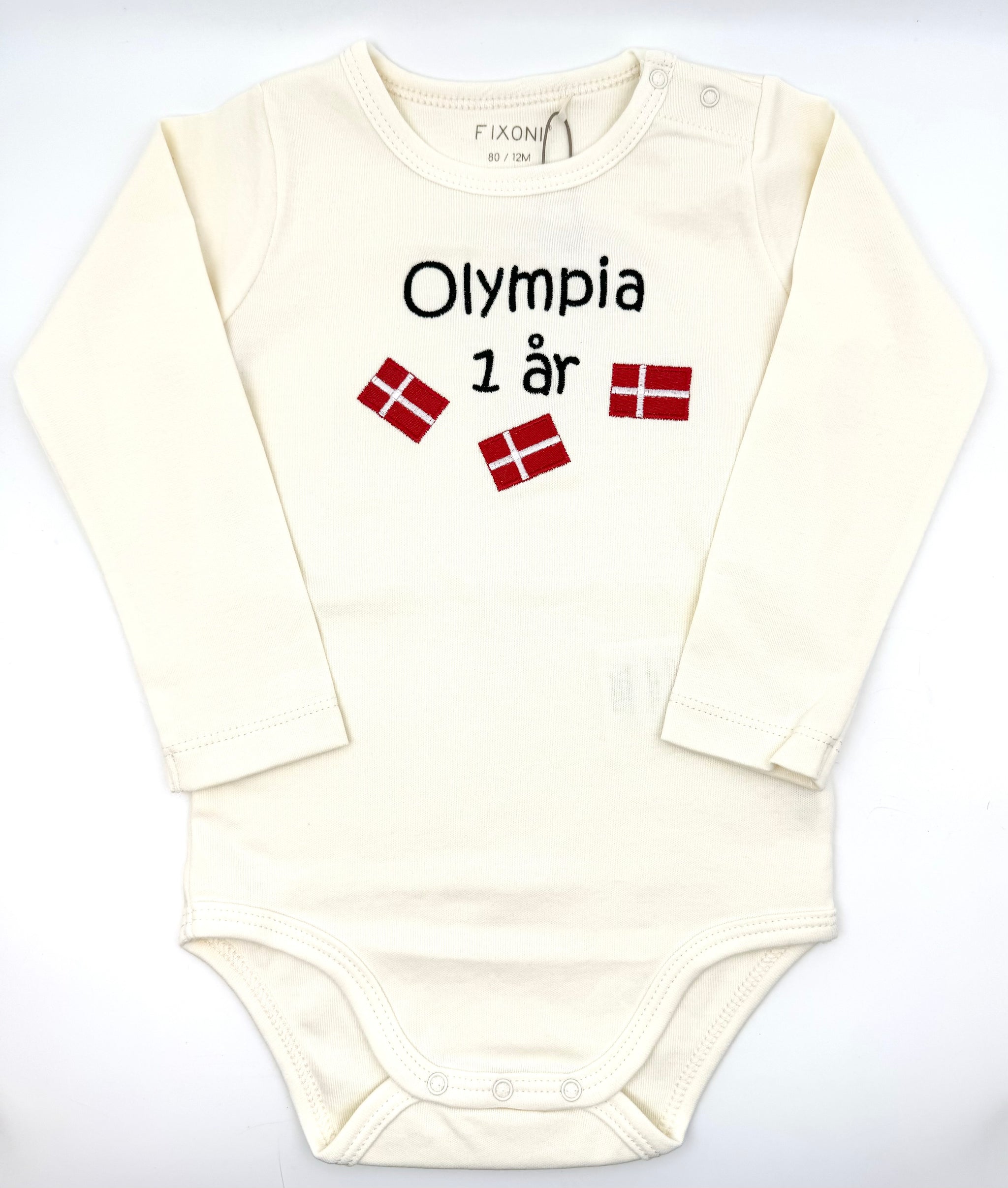 Skøn bodystocking med navn og flag broderet på maven. Bodyen har praktiske trykknapper på skulderen og imellem benene.