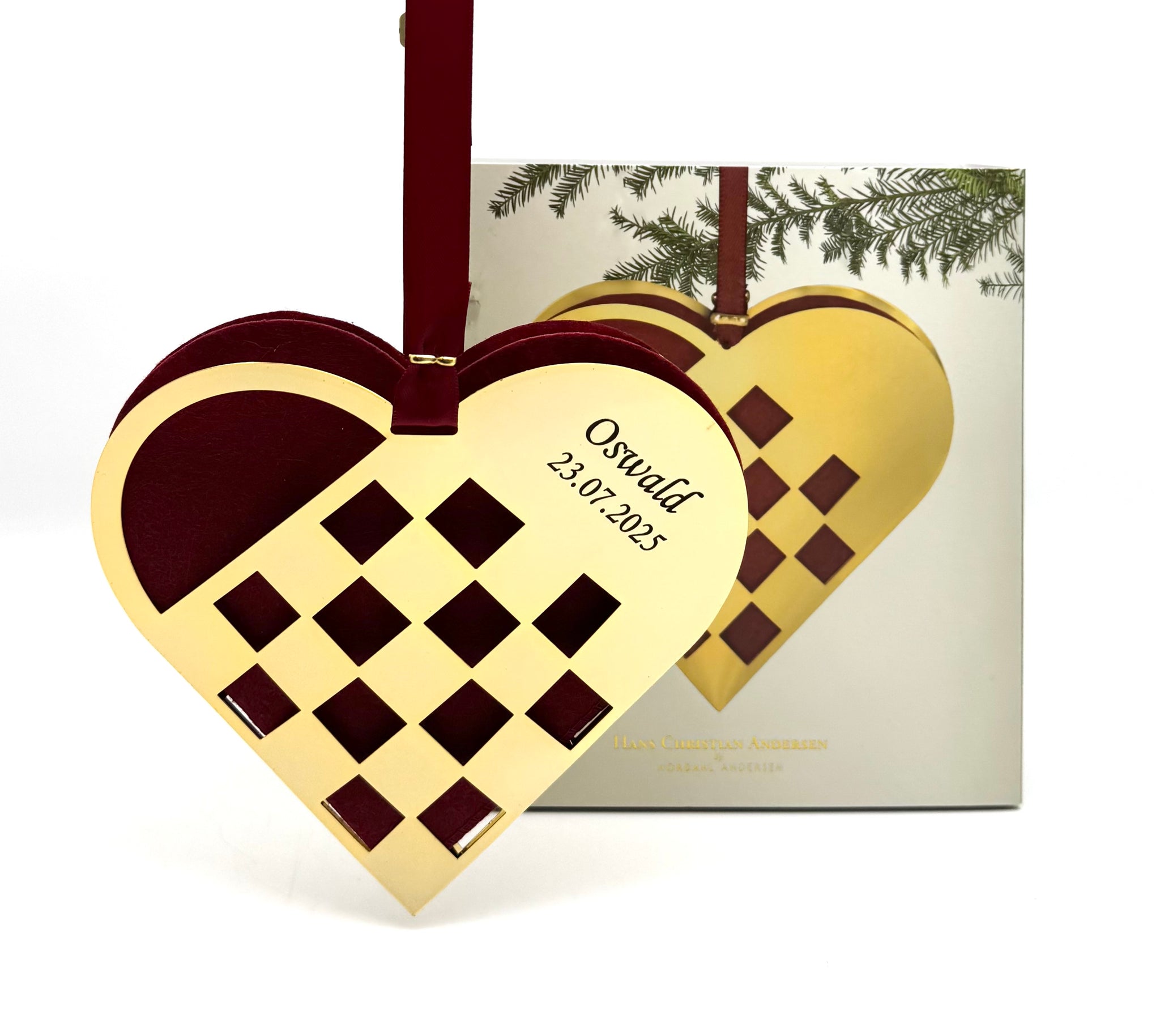 Smukt flettet julehjerte med forgyldt belægning. Hjertet er lavet med inspiration fra H.C. Andersens velkendte papirklip, nemlig det flettede julehjerte.