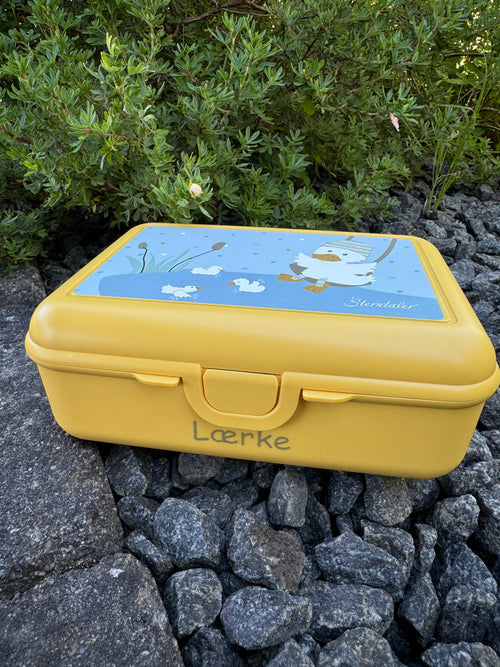 En praktisk madkasse inklusiv en rumdeler. Madkassen er lavet i et miljøvenligt plast materiale og har et fint print af en ælling på toppen.