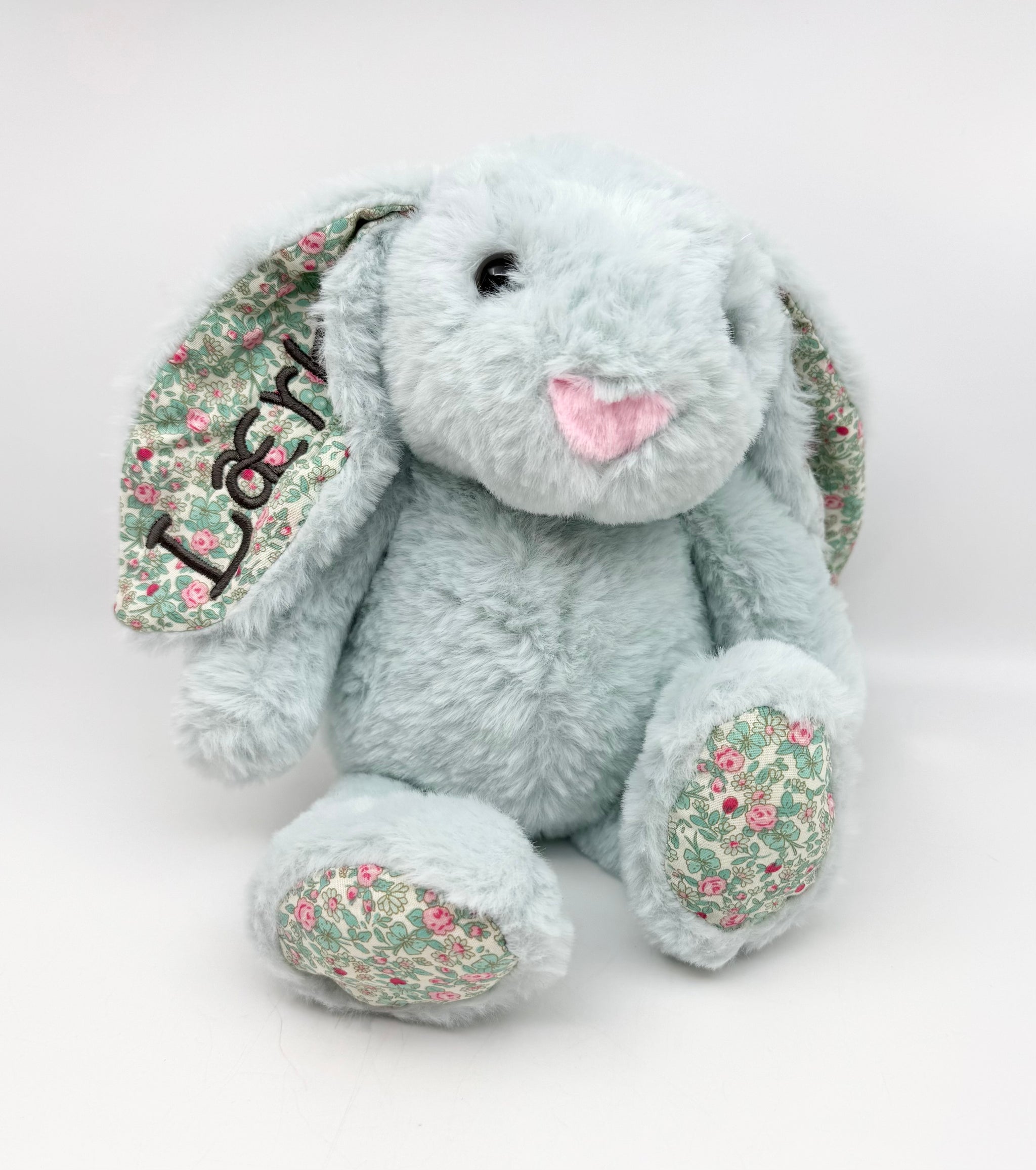 Har du ønske til trådfarve kan du lave en note til ordren, ellers broderes der med koksgrå. Bemærk at der broderes på det blomstrede stof i øret, bagsiden af broderi kan ses på den anden side af øret.