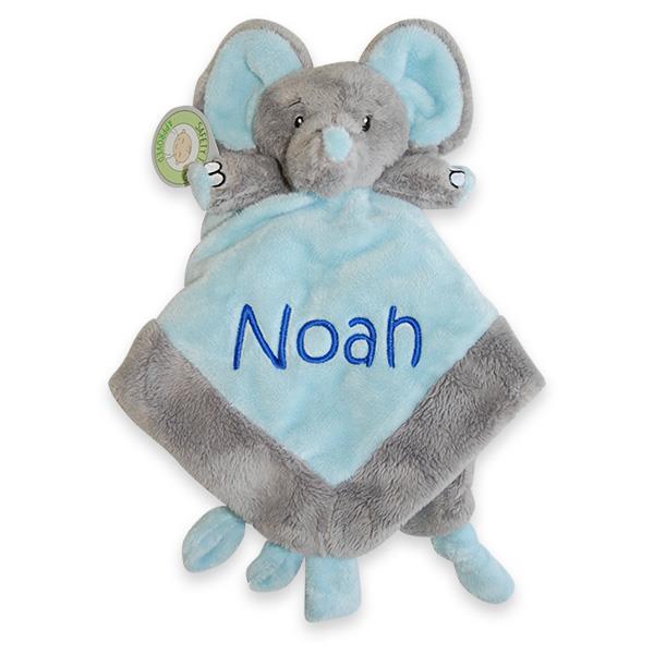 Denne nusseklud er lavet som en sød elefant i lyseblå farve med flotte grå nuancer. Detaljer såsom dens øjne og mund er blevet broderet, da det giver en bedre sikkerhed for baby.