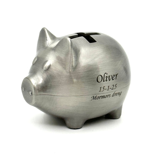 Lær barnet at spare penge op med en sparebøsse. En helt unik sparebøsse med indgraveret navn og dato vil helt sikkert falde i god smag til barnedåben, babyshower, navngivningsfesten eller fødselsdagen.