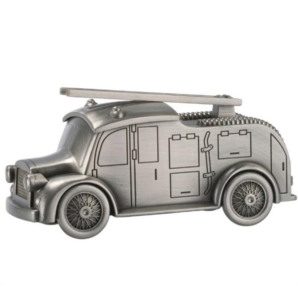 Rigtig fin sparebøsse formet som en brandbil. Sparebøssen er lavet i fortinnet stål, stigen kan køres op, og hjulene drejer frit rundt.