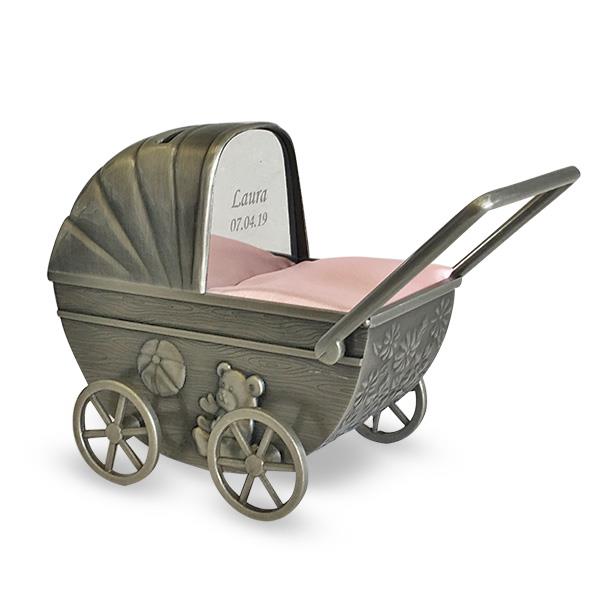 En helt unik og super sød sparebøsse formet som en dukkevogn. Sparebøssen er lavet i fortinnet stål, og har hjul som frit kan dreje rundt. Barnevognsstyret kan også frit justeres. I dukkevognens kaleche sidder der en plade lavet af forkromet stål, hvorpå der også kan graveres.
