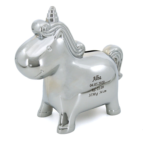 En helt unik og super sød sparebøsse formet som en enhjørning. Sparebøssen er lavet i forkromet stål, og har fine små detaljer omkring hår og hale. Den populære enhjørninge sparebøsse ville bringe massere af glæde hos pigebarnet, og vil pynte godt på børneværelset.