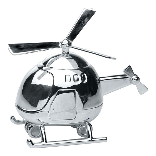 En helt unik sparebøsse formet som en helikopter lavet i forsølvet stål. Sparebøssen har 2 propeller som kan drejes frit rundt, en på toppen og en på halen.
