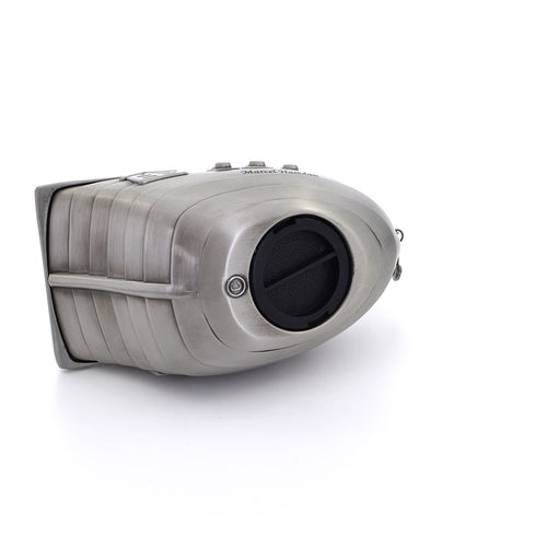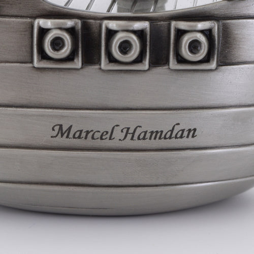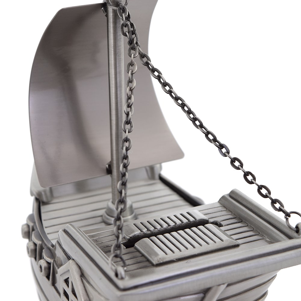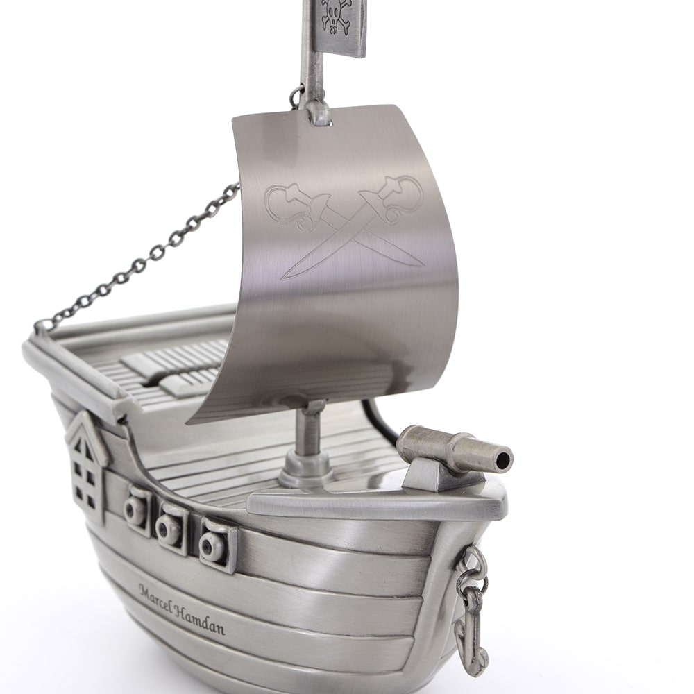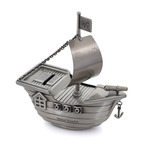 Flot sparebøsse lavet som et sørøverskib i fortinnet stål. Masten har kæder som hænger ned til skibets agterstavn. Vil se rigtig fin ud som pynt på børneværelset.
