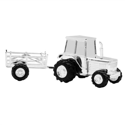 Flot sparebøsse lavet som en traktor i forkromet stål. Hjulene kan drejes frit rundt, og det samme kan hjulene på vognen. Vognen kan tages af traktoren hvis man ønsker dette. Vil se rigtig fin ud som pynt på børneværelset.