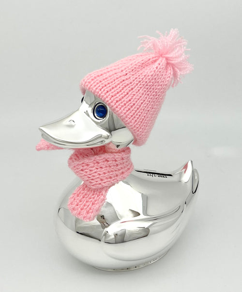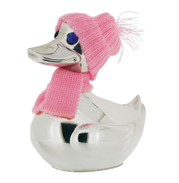 Sparebøsse - And med lyserødt halstørklæde - Forsølvet