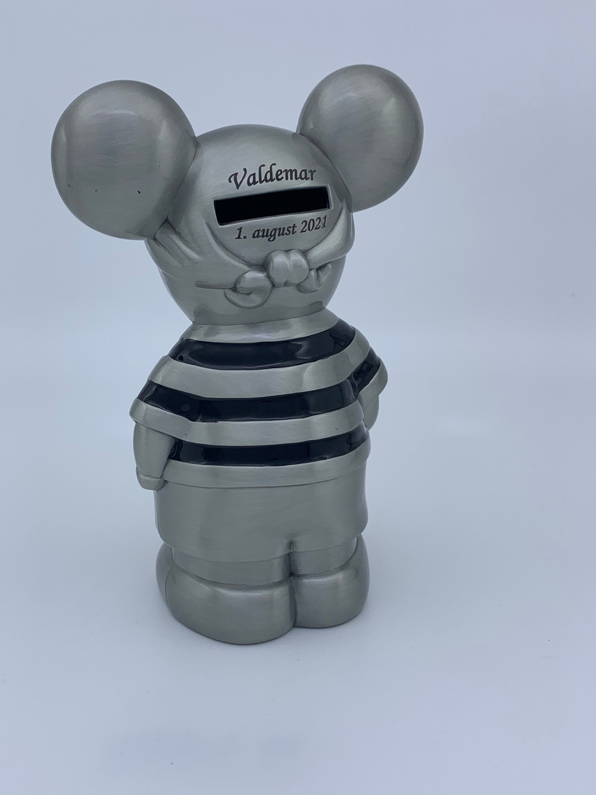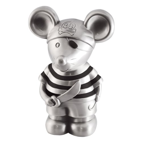 Flot sparebøsse lavet som en sørøver mus i fortinnet stål. Vil se rigtig fin ud som pynt på børneværelset.