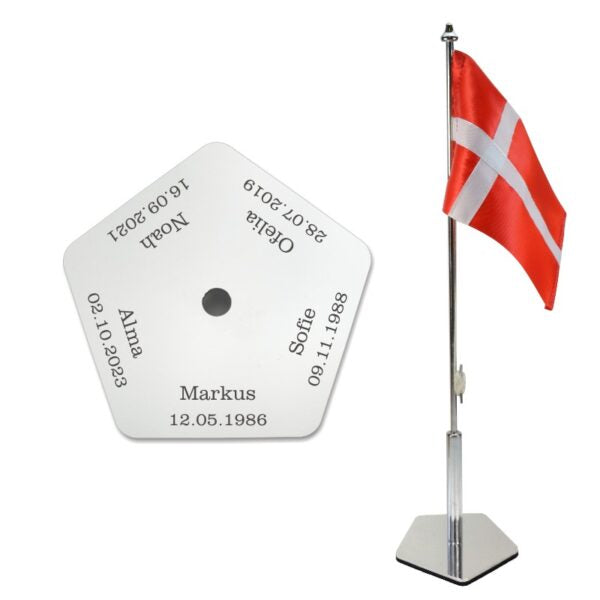 Dette bordflag er mere end blot pynt – det er et samlingspunkt for hele familien. Her er plads til alle familiens medlemmer, hvor navn og fødselsdato kan indgraveres på flagets bund, så det bliver et personligt og betydningsfuldt element i jeres hjem.